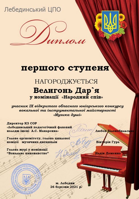З метою підтримки та розвитку творчих здібностей молоді, популяризації інструментального та вокального мистецтва, пісенних зразків національної культури 26 березня 2021 року відбувся IX відкритий обласний юніорський конкурс вокальної та інструментальної майстерності «Музика душі».
