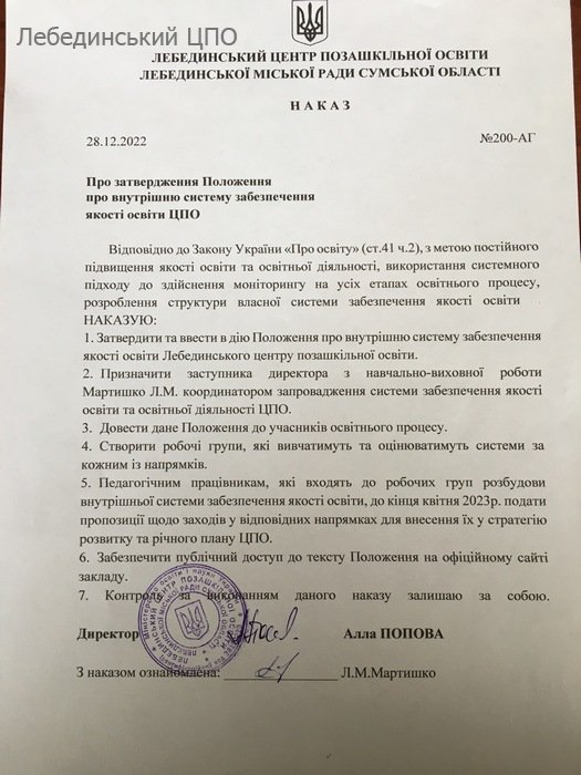 НАКАЗ ЦПО "ПРО ЗАТВЕРДЖЕННЯ ПОЛОЖЕННЯ ПРО ВНУТРІШНЮ СИСТЕМУ ЗАБЕЗПЕЧЕННЯ ЯКОСТІ ОСВІТИ ЦПО "