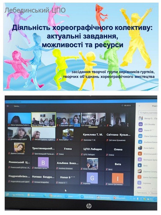 У режимі відеоконференції відбулося засідання творчої групи з теми «Діяльність хореографічного колективу: актуальні завдання, можливості та ресурси». До участі долучились і хореографи нашого закладу. Під час засідання розглядали питання щодо патріотичного виховання дітей та учнівської молоді засобами хореографії; презентаційної та проєктної діяльності дитячого хореографічного колективу; упровадження сучасних педагогічних технологій, спрямованих на підвищення виконавської майстерності вихованців колективів хореографічного мистецтва.