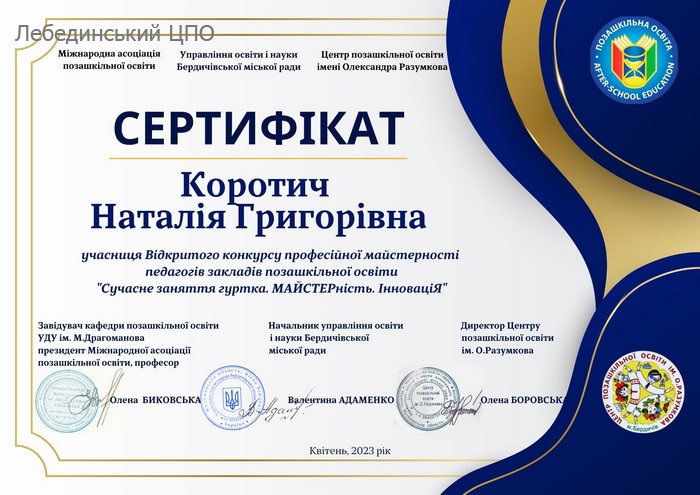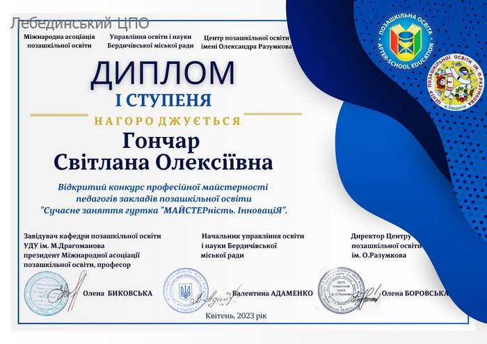 Одним із переможців конкурсу стала керівник гуртка Світлана Гончар і була нагороджена Дипломом I ступеня Міжнародної асоціації позашкільної освіти, а керівник гуртка Наталія Коротич отримала сертифікат учасника. Лебединський ЦПО отримав подяку за методичний супровід та професіоналізм учасників.