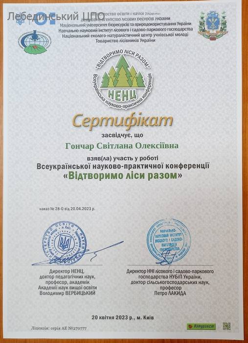 Вже вкотре взяла участь у цьому заході керівник гуртка «Юні лісівники» та керівник учнівського лісництва «Лісовичок» Світлана Гончар. За підсумками роботи конференції буде видана збірка матеріалів з досвіду роботи у цій галузі.
