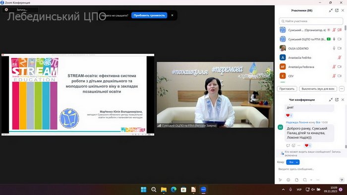 Методист Сумського обласного центру позашкільної освіти та роботи з талановитою молоддю Марченко Юлія Володимирівна акцентувала увагу учасників на тому, що STREAM-освіта є ефективною системою роботи з дітьми дошкільного та молодшого шкільного віку в умовах закладів позашкільної освіти, оскільки вона допомагає педагогам-позашкільникам долучити дітей до світу творчості, мейкерства, конструювання, дослідницько-експериментальної діяльності.