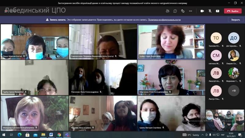 Згідно з планом роботи Сумського ОЦПО та РТМ, з метою підвищення фахового рівня педагогів творчих учнівських об’єднань еколого-натуралістичного напряму закладів позашкільної освіти 18 листопада на платформі дистанційної освіти Microsoft Teams відбулося засідання обласного методичного об’єднання з теми «Застосування засобів візуалізації даних в освітньому процесі закладу позашкільної освіти еколого-натуралістичного напряму». Педагоги еколого-натуралістичного відділу нашого закладу у повному складі взяли участь в МО.