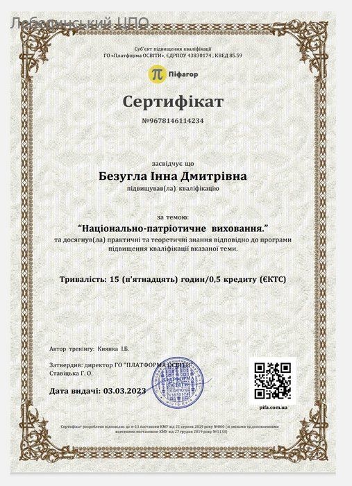 ПІДВИЩУЄМО ПЕДАГОГІЧНУ КВАЛІФІКАЦІЮ З метою підвищення кваліфікації педагогів з національно-патріотичного виховання учнів старшого шкільного віку, ознайомлення із новими підходами щодо розвитку громадянської освіти керівник гуртків Інна Безугла пройшла навчання дистанційного курсу і отримала сертифікат.