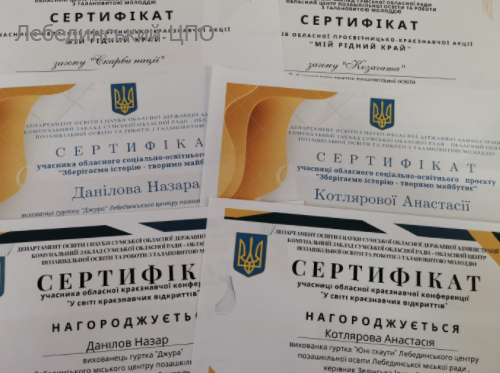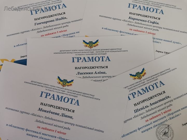 ³òàºìî ïåðåìîæö³â îáëàñíîãî ôåñòèâàëþ ìèñòåöòâ «Ïåðëèíè íàøî¿ äóø³» (íàïðÿì ä³ÿëüíîñò³ «Êâ³ë³íã») Ìîêå³÷åâó ijàíó, Øåï³ëü Àíàñòàñ³þ, Êàðïåíêî Ñîô³þ, Ãîí÷àðîâó Íàä³þ, Ëèñåíêî Àë³íó òà ¿õ êåð³âíèê³â ãóðòê³â Îëüãó Ïðîí³êîâó òà Àëëó Âå÷åðêó.