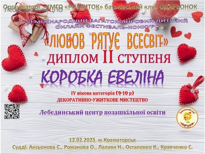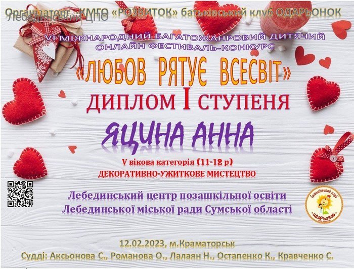 ³òàºìî ßöèíó Àííó, âèõîâàíêó òâîð÷îãî îá’ºäíàííÿ «Õóäîæí³é ðîçïèñ» (êåð³âíèê Íàòàë³ÿ Êîðîòè÷) òà Êîðîáêó Åâåë³íó, âèõîâàíêó ãóðòêà «Ïðèðîäà ³ ôàíòàç³ÿ» (êåð³âíèê Ëþäìèëà Çóáêî) ³ç ïðèçîâèìè ì³ñöÿìè â ̳æíàðîäíîìó áàãàòîæàíðîâîìó äèòÿ÷îìó îíëàéí ôåñòèâàë³-êîíêóðñ³ «Ëþáîâ âðÿòóº Âñåñâ³ò». Áàæàºìî íîâèõ äîñÿãíåíü.