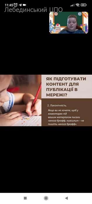 Нещодавно вихованці гуртка «Юні журналісти» долучилися до обласної школи журналістики. Юні майстри пера на онлайн-занятті опрацьовували новий теоретичний матеріал, а також мали можливість й попрактикуватися. Діти обговорювали проблеми інформаційної війни, медіаграмотності, знайомилися із ChatGPT, а також вчилися створювати матеріали для соціальних мереж, шукати теми та підбирати креативні заголовки.
