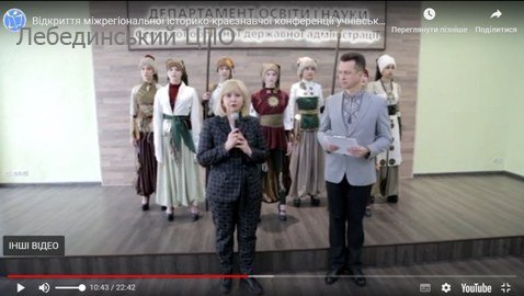 Äåïàðòàìåíòîì îñâ³òè ³ íàóêè Ñóìñüêî¿ îáëàñíî¿ äåðæàâíî¿ àäì³í³ñòðàö³¿ òà Êîìóíàëüíèì çàêëàäîì Ñóìñüêî¿ îáëàñíî¿ ðàäè – îáëàñíèì öåíòðîì ïîçàøê³ëüíî¿ îñâ³òè òà ðîáîòè ç òàëàíîâèòîþ ìîëîääþ 30 áåðåçíÿ áóëà ïðîâåäåíà ̳æðåã³îíàëüíà ³ñòîðèêî-êðàºçíàâ÷à êîíôåðåíö³ÿ ó÷í³âñüêî¿ ìîëîä³ «²ñòîðè÷íà ïàì’ÿòü â óìîâàõ ñó÷àñíî¿ â³éíè».
