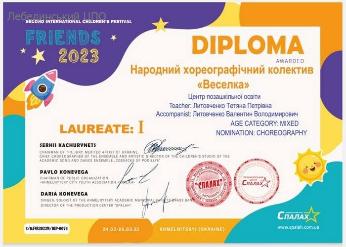 Вітаємо вихованців народного хореографічного колективу «Веселка» з черговими високими нагородами (керівник Тетяна Литовченко).