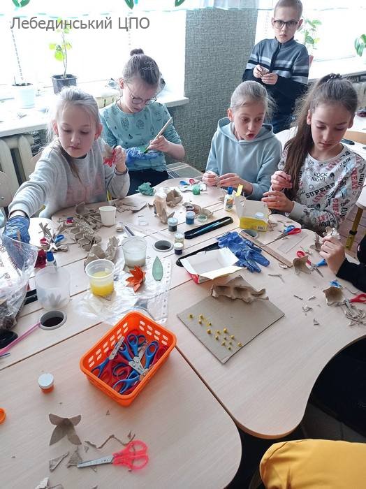 Під час заняття вихованці гуртка «Початкове технічне моделювання» поглибили свої знання про історію, звичаї та традиції святкування Великодня. Діти виготовили колективну великодню композицію з екологічних матеріалів.