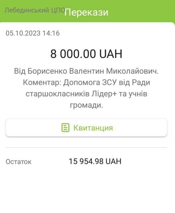 Старшокласники Лебединської громади вдячні ЗСУ за можливість навчатися, спілкуватися з однолітками, брати участь у творчих заходах. Тому кошти у сумі 8000грн., зібрані під час проведення благодійних ярмарок, передані фонду «Піксель у вишиванці».