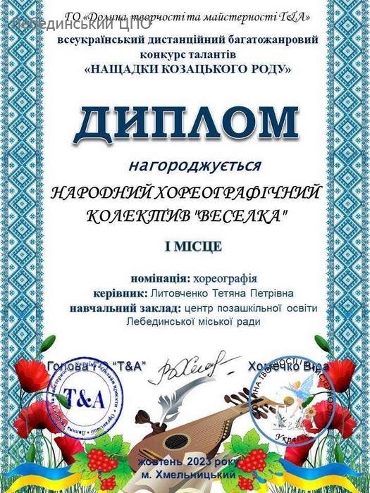 Вітаємо вихованців «Веселки» ще з однією перемогою (І місце) у Всеукраїнському дистанційному багатожанровому конкурсі талантів «Нащадки козацького роду». Бажаємо юним хореографам, їх керівнику Тетяні Петрівні нових творчих злетів та феєричних виступів.
