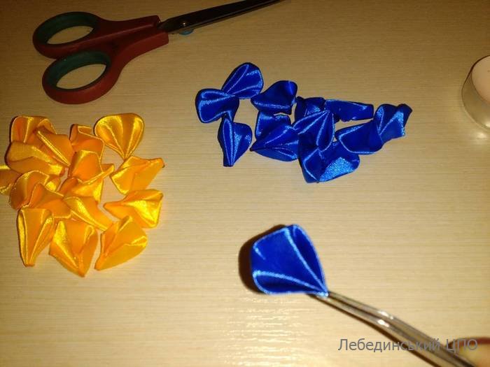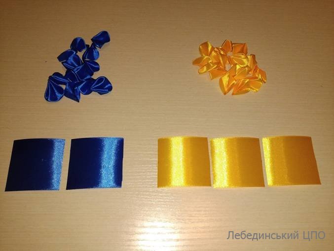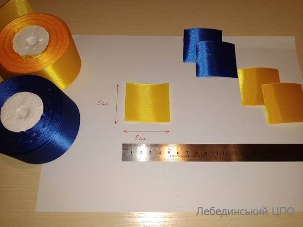 2. З атласної стрічки синього кольору нарізаємо 2 квадрати зі стороною 5 см та 3 квадрати жовтого кольору зі стороною 5 см.