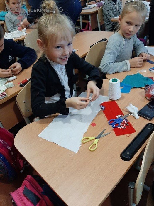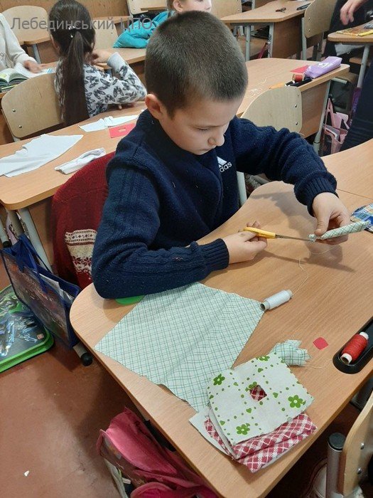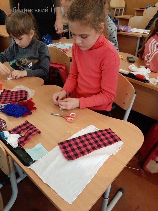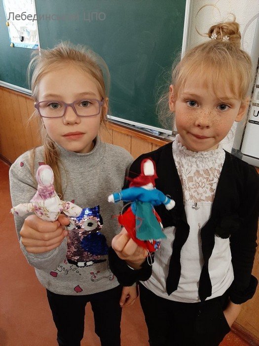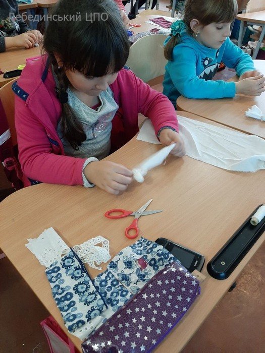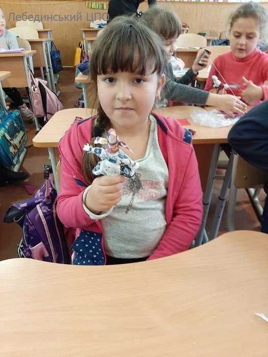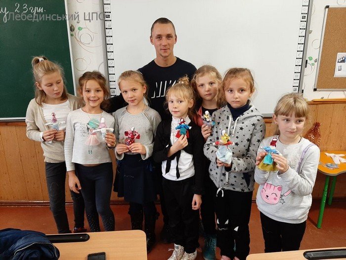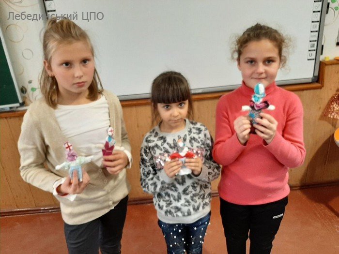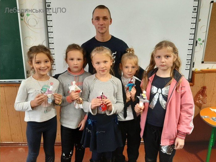 Тому, вихованці гуртка «Образотворче мистецтво та ДПМ» (керівник Верхова Олена) зі студентом-практикантом Лебединського педагогічного коледжу Володимиром Фальком у своєму творчому об’єднанні ознайомились із народною іграшкою та навчились виготовляти ляльки-мотанки.