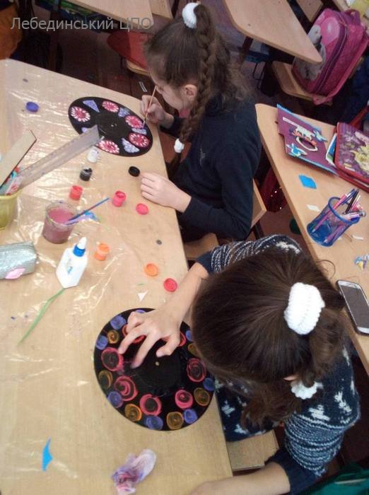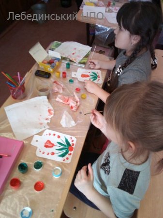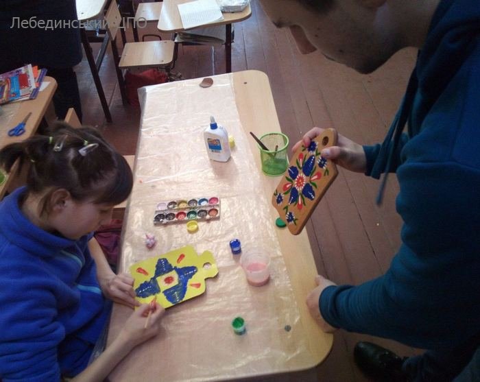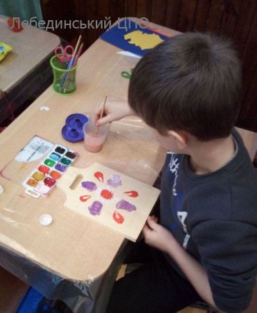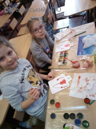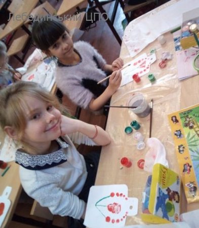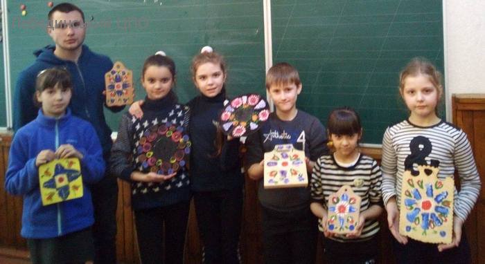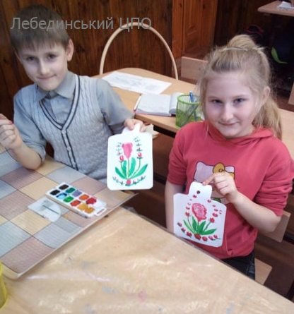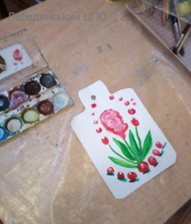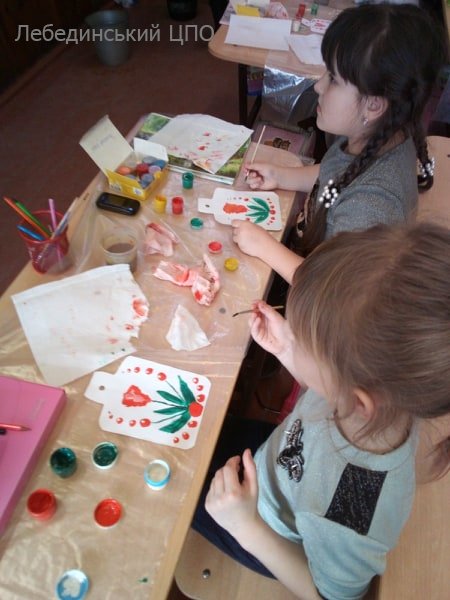 Мало хто знає, що в Україні, крім петриківського, є ще багато маловідомих красивих видів розпису. Одним із таких є слобожанський, відомий як старобільський розпис. Знаєте, чим він особливий? Його роблять пальцями. Слобожанський розпис – це декоративне оздоблення практичних предметів. Століття два тому на Слобідській Україні таким розписом прикрашали побілені стіни сільських хат, кухонні дошки, мисники, але найбільше – скрині, особливо весільні. Саме цим мистецтвом розпису і зайнялись у творчій невимушеній атмосфері вихованці гуртка «Образотворче мистецтво та ДПМ» зі студентами педагогічного коледжу Убираєвим Миколою та Огієнком Максимом. Діти оздоблювали паперові та дерев’яні кухонні дощечки, платівки пальцевим розписом. Виготовлені вироби стануть окрасою побуту, бо несуть у оселі добробут, злагоду і любов.