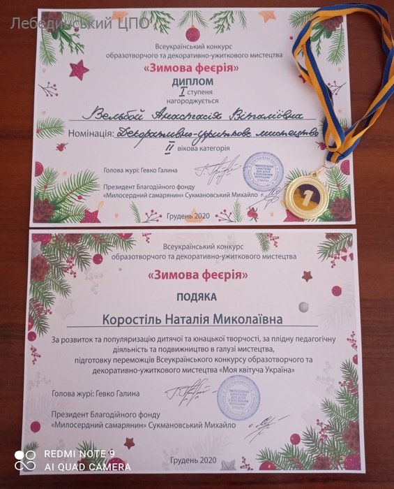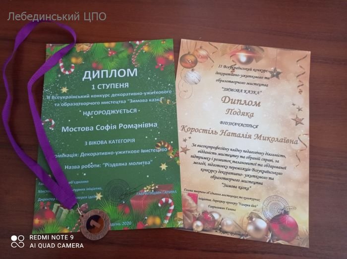 Нещодавно відбулися Всеукраїнські онлайн-конкурси образотворчого та декоративно-ужиткового мистецтва «Зимова феєрія» та "Зимова казка". Вихованки закладу Анастасія Вельбой, Мостова Софія та Іщенко Дарина (керівники гуртків Коростіль Н. М. та Іщенко Л.В.) активно долучилися до даних конкурсів. Журі високо оцінило роботи наших учасниць та нагородило їх дипломами І ступеня. А керівників гуртків відзначено подяками за розвиток та популяризацію дитячої та юнацької творчості.