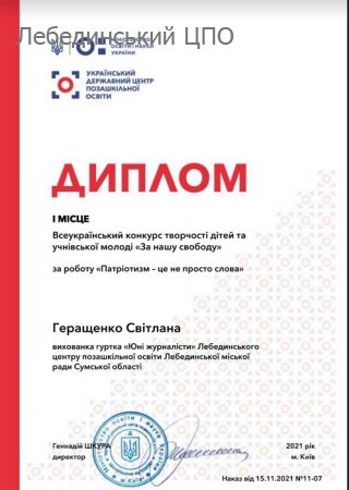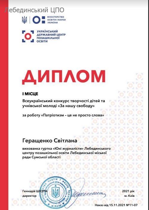 Гаращенко Світлана вихованка гуртка «Юні журналісти» (керівник Анастасія Федірко) нагороджена дипломом І ступеня Українського державного центру позашкільної освіти у розділі «Поезія» з теми «Листи на фронт» за роботу «Патріотизм – це не просто слова».