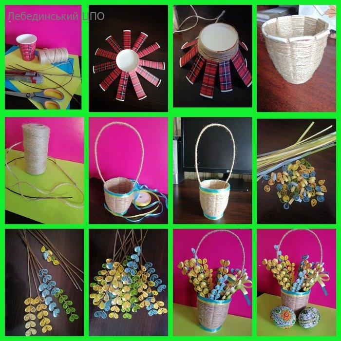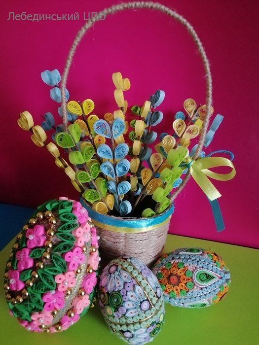 Хочеться вірити, що напередодні великого християнського свята Христового Воскресіння наша Батьківщина здобуде мир та перемогу, а у серцях всіх людей оселиться спокій та віра в щасливе майбутнє. Сподіваються на це і вихованці гуртка «Квілінг» (керівник Ольга Пронікова). Діти продовжують дистанційне навчання та долучаються до онлайн-занять, майстер-класів, виконують практичні та теоретичні завдання. Пропоную своїм вихованцям та всім бажаючим майстер-клас з виготовлення кошика з вербовими гілочками, як символу пробудження всього живого та перемоги добра.