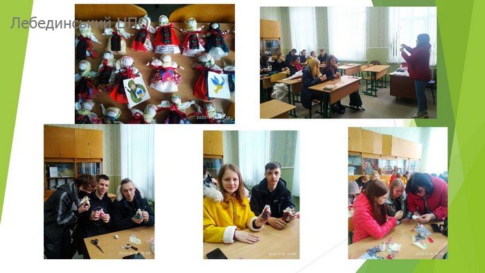 Стало доброю традицією проводити спільні заходи з педагогами та студентами КЗ СОР «Лебединський педагогічний коледж імені А. С. Макаренка». В рамках проведення акції «Добрі справи для світлого дня» керівник гуртків Юлія Нездоймишапка організувала для студентів майстер-класи з виготовлення оберегів для дітей-переселенців. Кожен учасник вклав частинку тепла та добра своєї душі у подарунок для малечі.