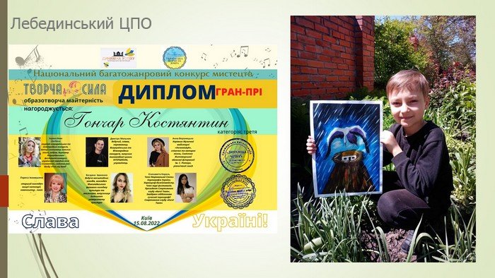 Вітаємо Гончара Костянтина, вихованця гуртка «Образотворче мистецтво та ДПМ», з Гран-прі в Національному багатожанровому конкурсі мистецтв «ТВОРЧА СИЛА».