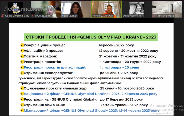 Особливу увагу було зосереджено глобальному розумінню екологічних проблем і досягненню сталого розвитку за допомогою фундаментальних наук, мистецтва, креативного письма, інженерії, дизайну та розвитку бізнесу. Під час семінару було обговорено питання щодо алгоритму підготовки та реєстрації учнівських проєктів для участі в Національному етапі GENIUS Olympiad Ukraine.