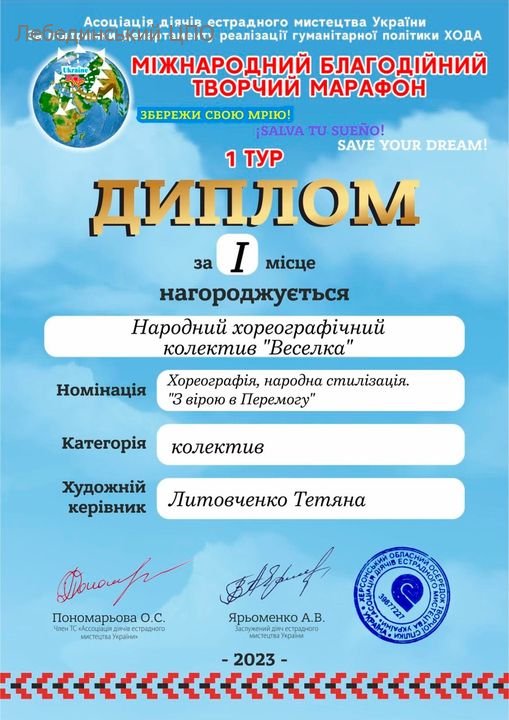 Дякуємо організаторам та журі Міжнародного благодійного творчого марафону за високу оцінку та схвальні відгуки на рахунок виступу нашого колективу.